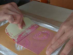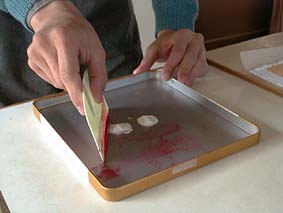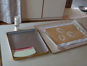 | 1. 布の上に型を置き、用意した糊を塗ります。 |